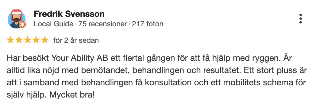 Hos oss på Your Ability får du som kund alltid en behandling som är specifikt anpassad till dina unika behov. Vi har lång erfarenhet och med många olika behandlingmetoder så kan vi ge dig en optimal rehabilitering.